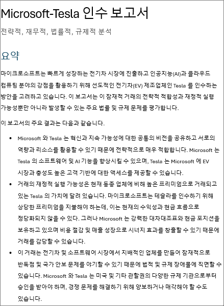 전략적 이점, 법률 및 규제 평가, 재정적 영향, 통합 전략을 간략하게 설명하는 간결한 보고서를 제공합니다. 보고서에는 시장 분석, 회사 분석, 재무 예측, 법률 및 규제 고려 사항, 시너지 잠재력, 통합 계획, 위험 관리 전략 및 실행 일정이 포함되어야 하며 실행 가능한 권장 사항으로 마무리되어야 합니다.