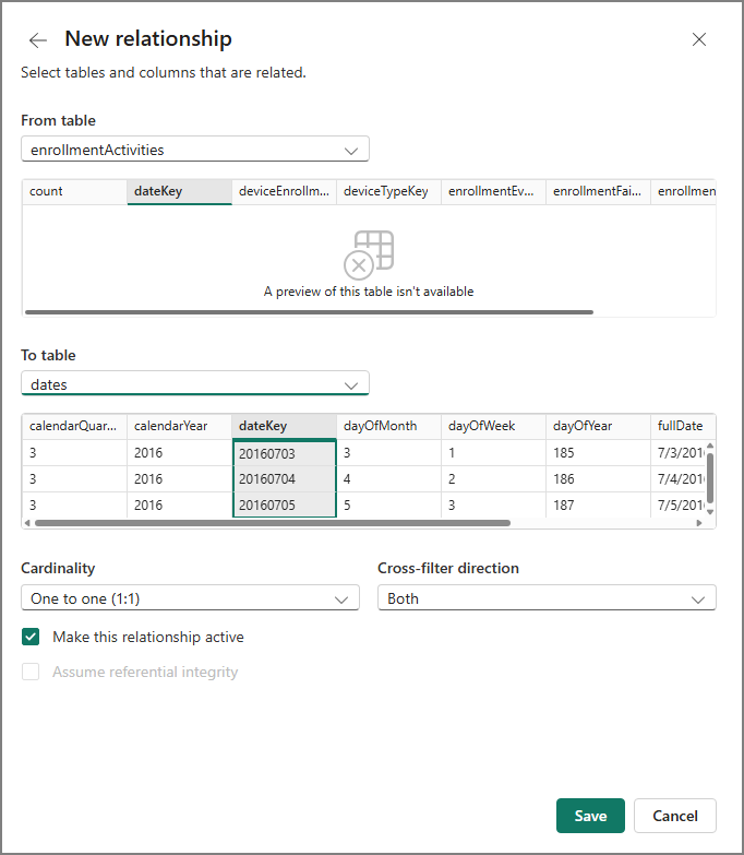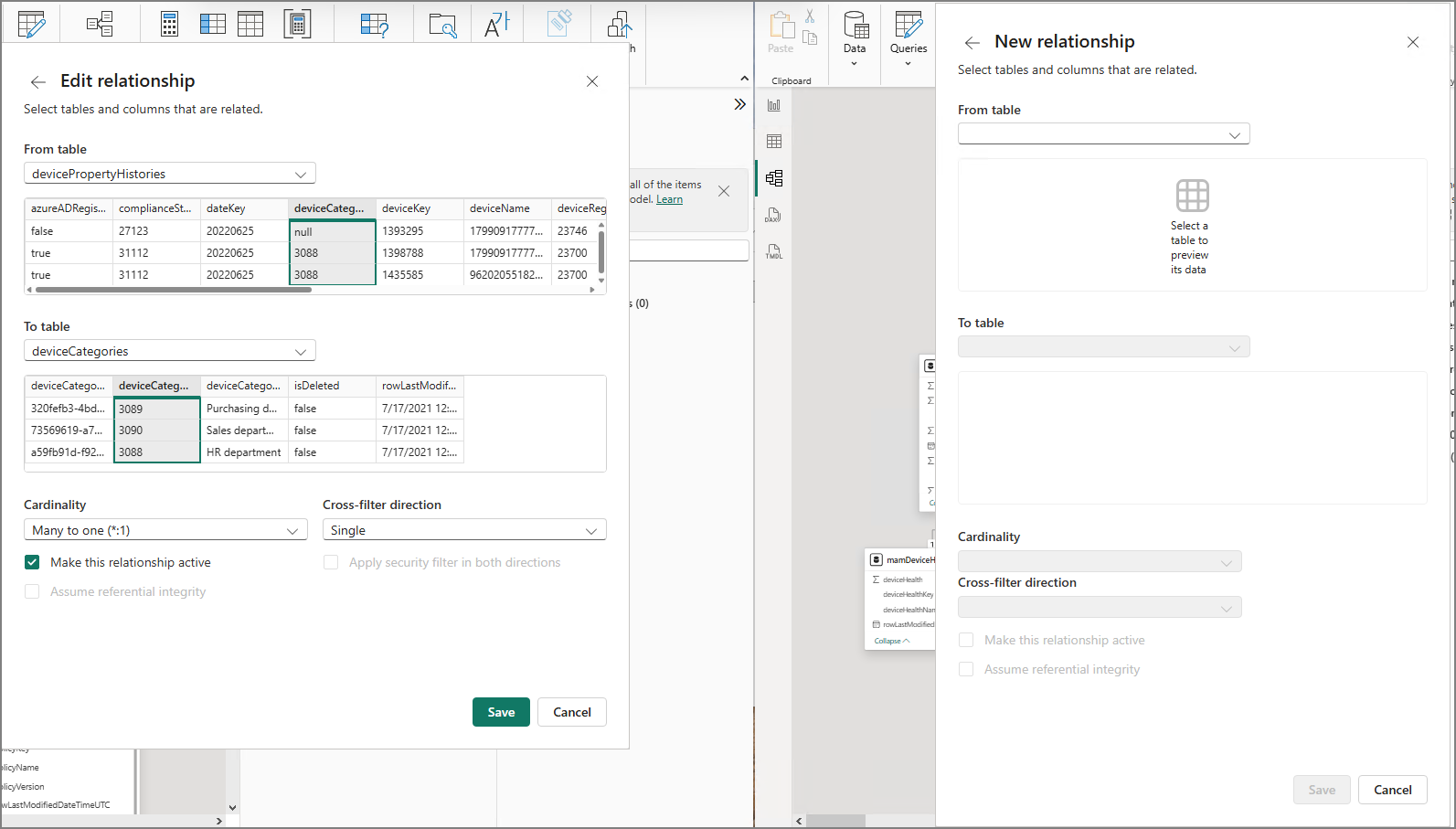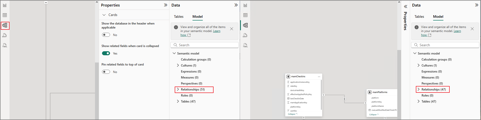 템플릿에는 존재하는 관계가 내 BI에는 존재하지 않는 것을 알 수 있습니다.