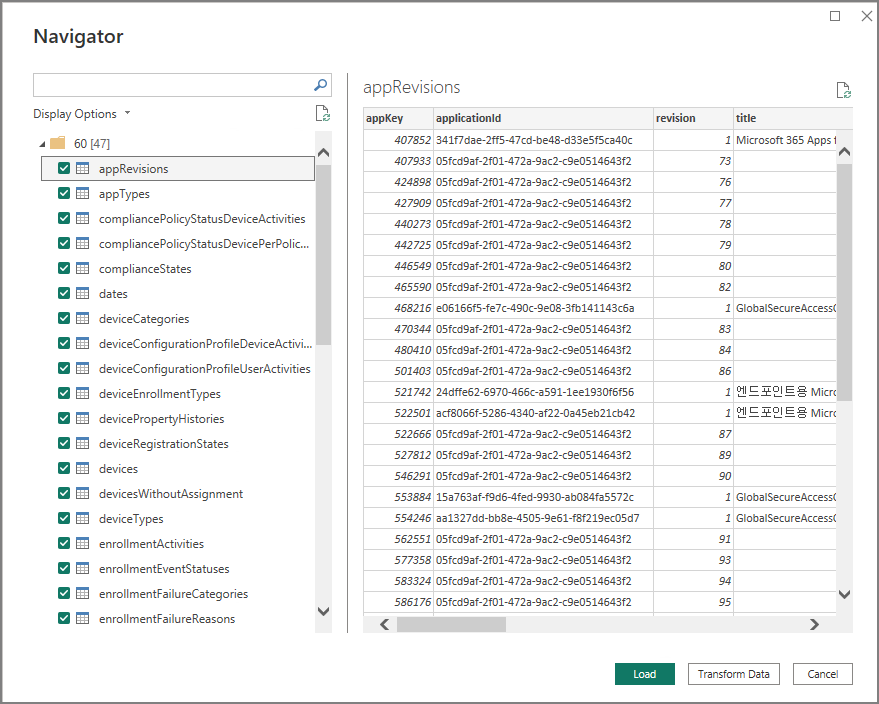 가져올 수 있는 Table이 전부 나열됩니다. -> 전부 체크 -> Load