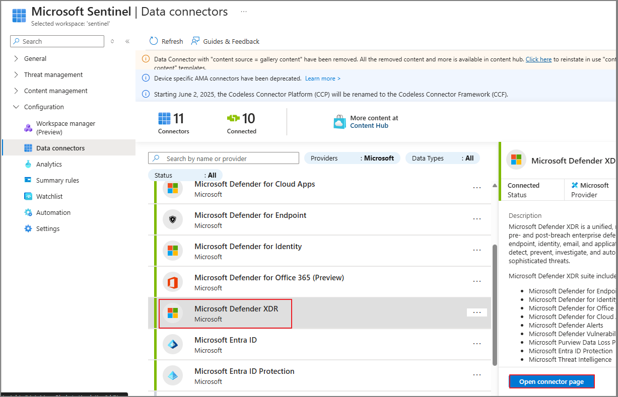 커넥터 설정: Microsoft Defender XDR → Open connector page