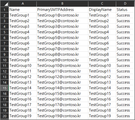 Group OU에 아래의 CSV 파일을 이용하여 메일 그룹 생성에 대한 요청을 받았습니다.