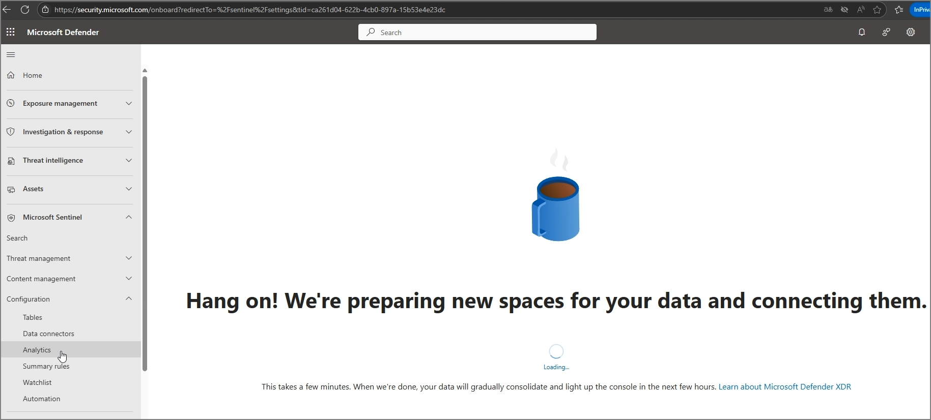 Defender (Security.microsoft.com)이동하여 Microsoft Sentinel을 클릭하면 프로비저닝 되는 것을 확인할 수 있습니다.