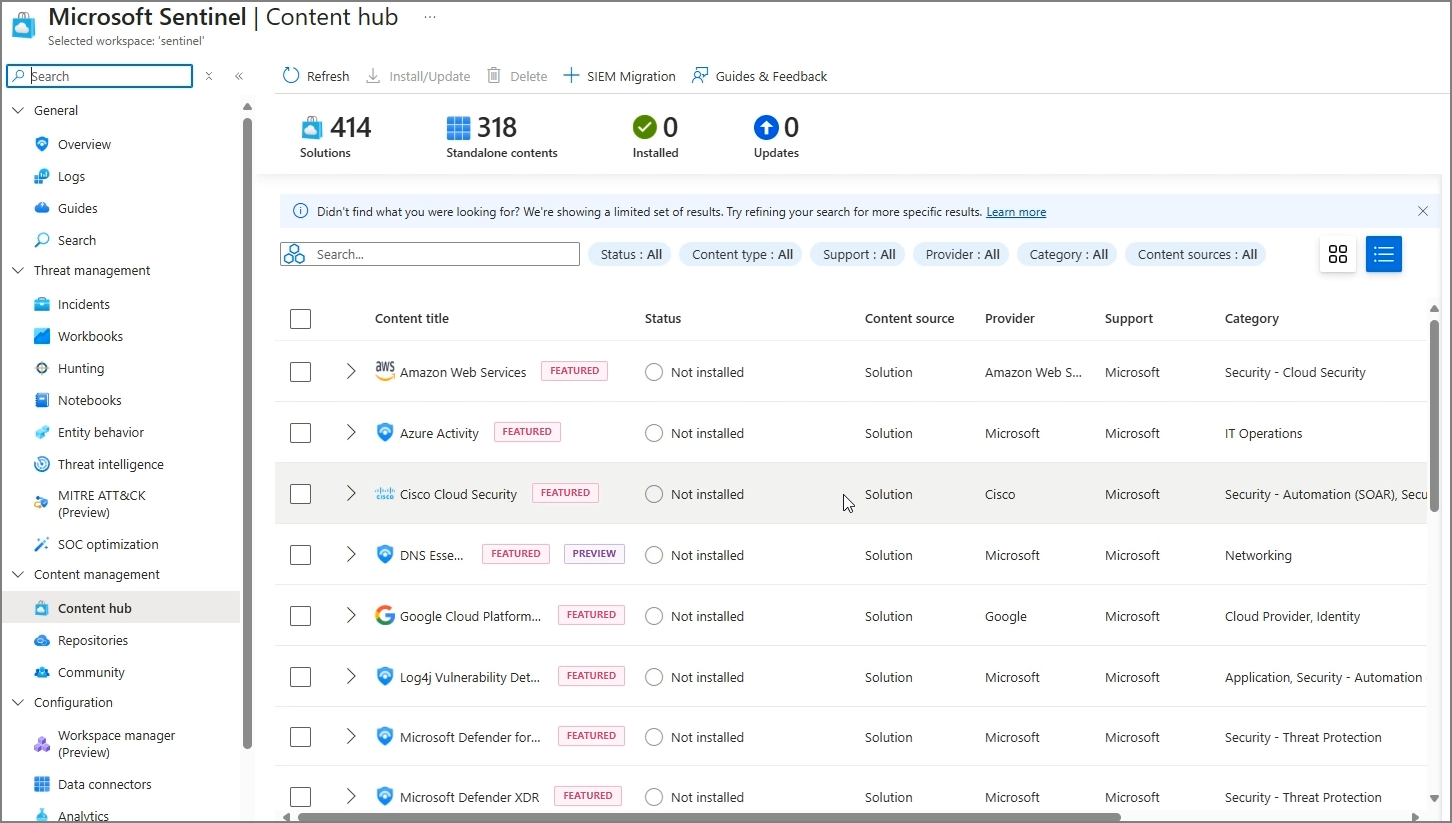 Azure 상의 Sentinel - Content hub에서 새로고침을 진행하면, 다음과 같이 추가할 수 있는 Content 들을 확인할 수 있습니다.