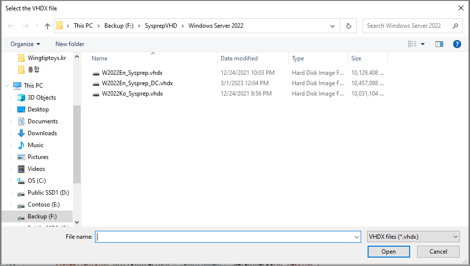 그런데 뭔가 아쉽습니다. 폴더를 확장하면서 VHDX 파일을 한번에 선택하면 좋을 것 같습니다.