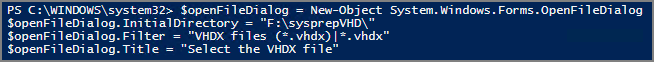 $openFileDialog.InitialDirectory = "F:\sysprepVHD\"