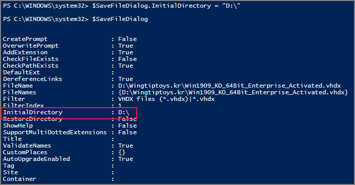 $openFileDialog.InitialDirectory = "F:\sysprepVHD"