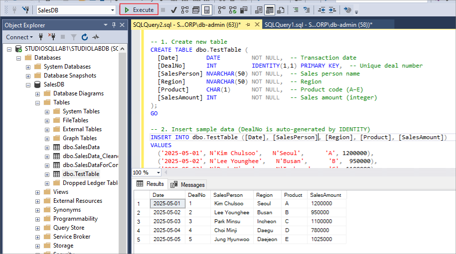 INSERT INTO dbo.TestTable ([Date], [SalesPerson], [Region], [Product], [SalesAmount])