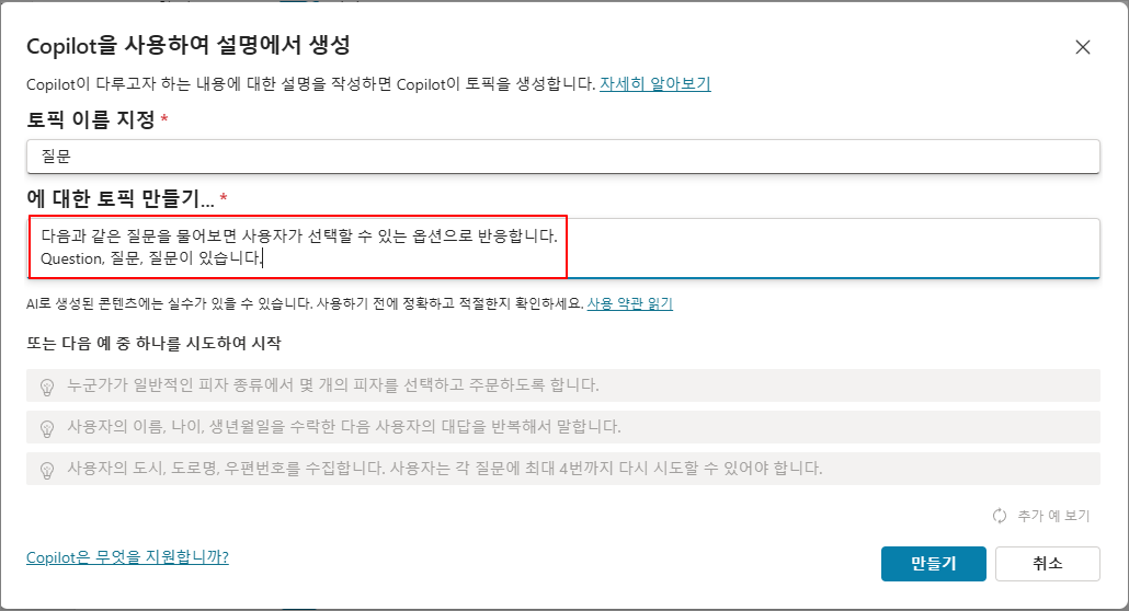 토픽 -> 토픽 추가 -> Copilot 사용하여 설명에서 생성