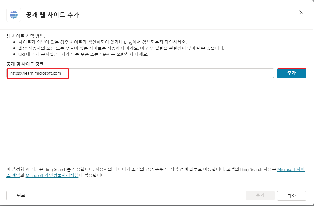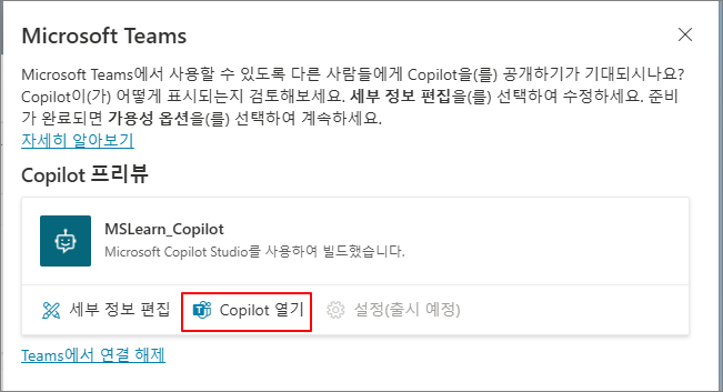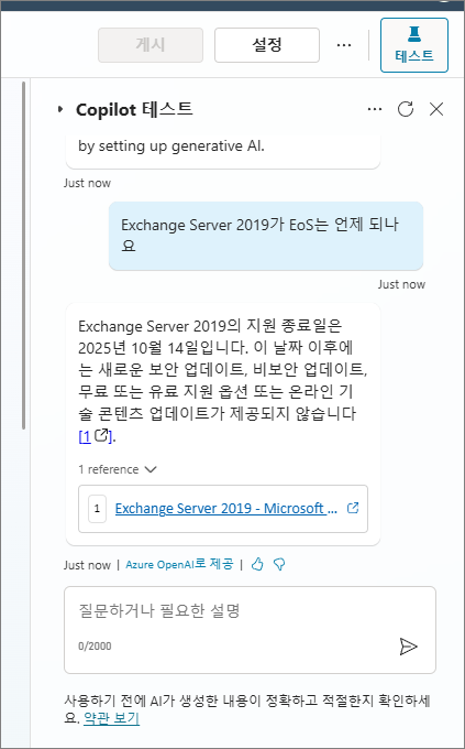 우측의 Copilot 테스트 채팅창에서 질문을 입력하여 답변이 올바르게 진행되는지 확인합니다.