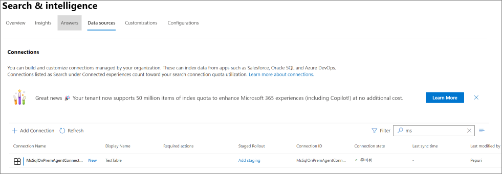 Graph Connector가 연결된 뒤, 아래와 같이 Copilot Studio에서 SQL Server를 참조 자료로 추가할 수 있습니다.