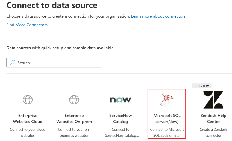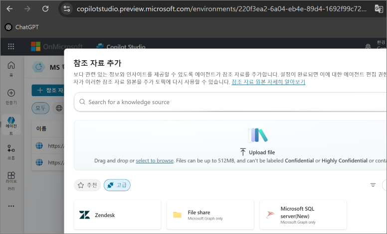 Graph Connector 연결된 , 아래와 같이 Copilot Studio에서 SQL Server 참조 자료로 추가할 있습니다.