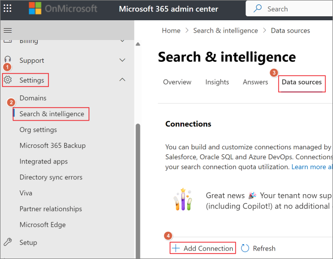 Settings -> Search & intelligence -> Data sources -> Add Connection