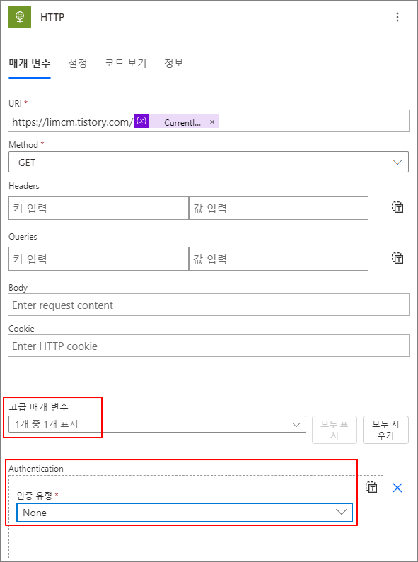 만약 사이트 인증이 필요하다면 하단의 고급 매개 변수를 지정해서 진행합니다. -> 저는 공개 페이지이기 때문에 패스