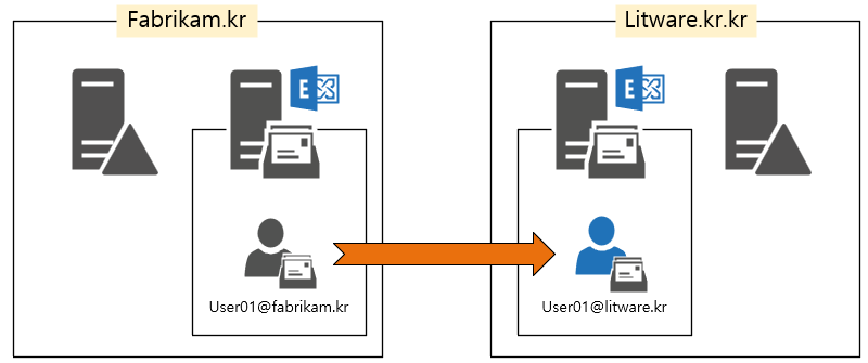 Fabrikam.kr 에서는 User01이 Mailbox -> Mail User로 변경되었습니다.