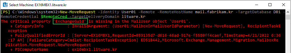 다음 명령어로 마이그레이션을 시도하면, ExchangeGuid 값을 찾을 수 없다는 오류가 발생합니다. 즉 Exchange Guid를 동일하게 입력해 줘야합니다.