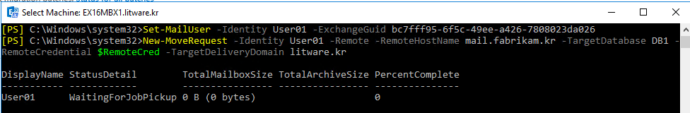 New-MoveRequest -Identity User01 -Remote -RemoteHostName mail.fabrikam.kr -TargetDatabase DB1 -