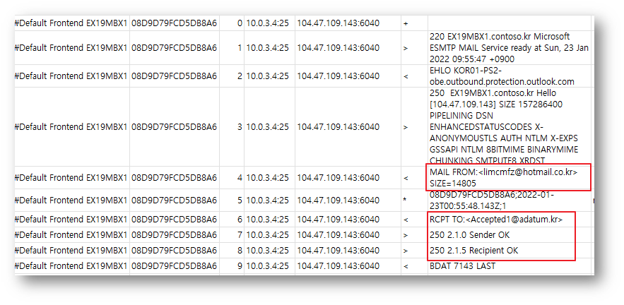 Frontend Receive 로그를 보면 250 2.1.5 Recipient OK 기록이 확인됩니다.