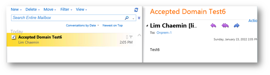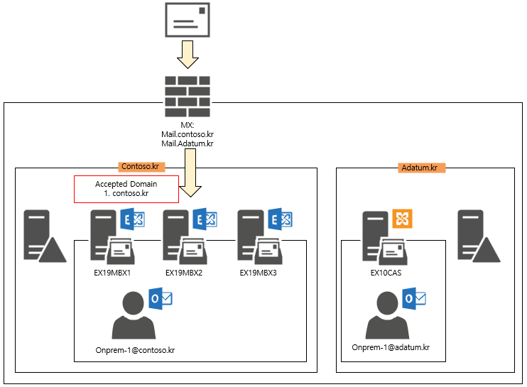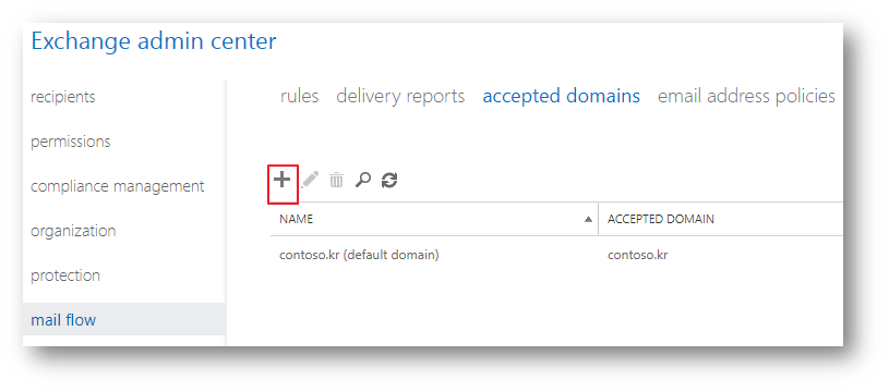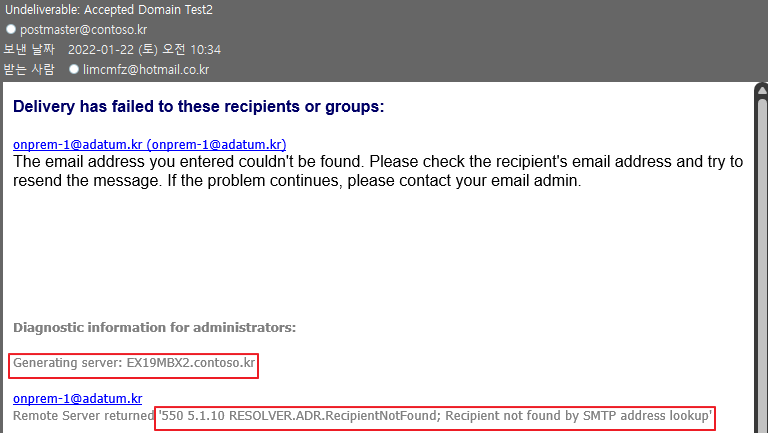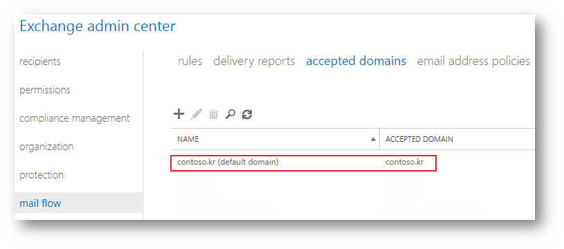 우선 Accepted domain 은 contoso.kr 만 등록된 상황에서 테스트 진행