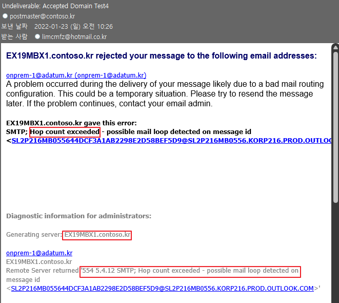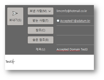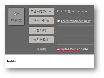 당연하겠지만 발송은 성공하지 않습니다. 왜냐하면 MX 레코드 자체가 contoso.kr과 동일한 서버를 가르키고 있기 때문에 추가적인 설정이 없다면, adatum.kr 서버로 발송 할 수 없습니다.