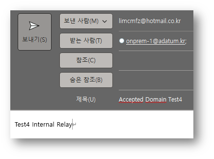 결론적으로 Internal Relay는 내부에 사서함이 있으면 우선확인하여 발송하고, 사서함이 없다면 MX레코드를 조회하여 외부로 발송시도하는 것으로 확인됩니다. 테스트를 진행해 보면 아래의 문구에 대해서도 이해할 수 있습니다.