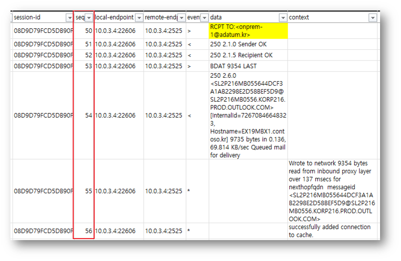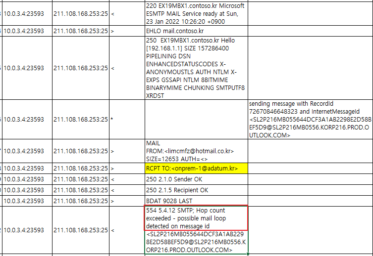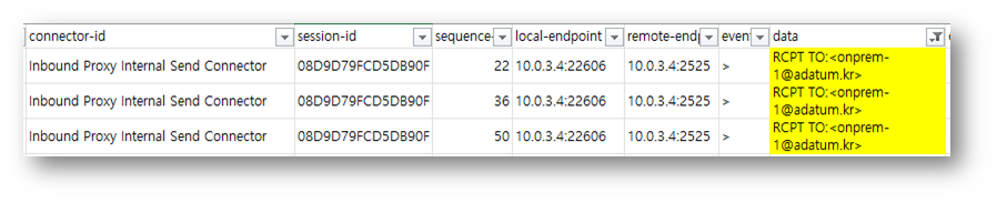 Hub - SMTP Send 로그 확인시 3차례 시도가 확인되며, Internet -> Default frontend Connector 와 루프가 진행된 것을 확인할 수 있습니다.