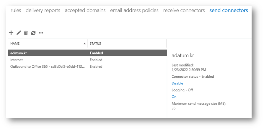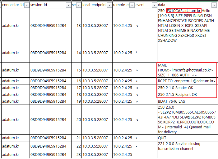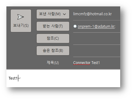 Adatum.kr 로 생성한 커넥터를 통해서 전달되는 것을 확인할 수 있습니다.