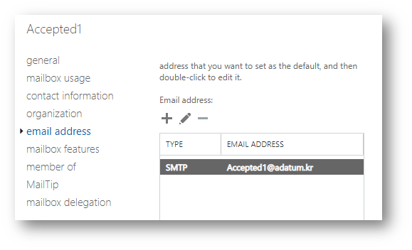 이번에는 실제 Adatum.kr 로 구축한 Exchange Server 2010 에는 onprem-1@adatum.kr 주소의 사서함을 만들고 contoso.kr에는 만들지 않는 시나리오로 진행해 보겠습니다.