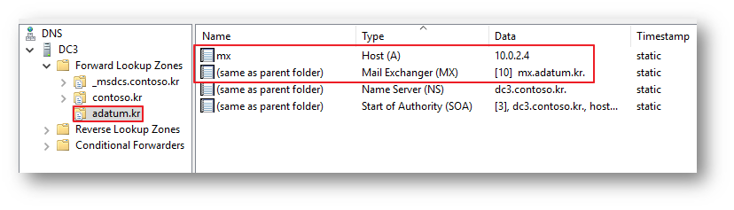 DC의 DNS에서 adatum.kr Zone 을 생성한 뒤, MX 레코드를 등록합니다.