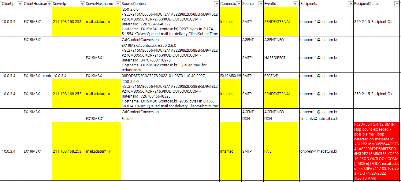 Get-messagetrackinglog 를 통해서 확인해 보면 Internet 이라는 송신커넥터로 3차례 외부로 발송하였으나 루프도는 것으로 감지하여 실패처리 된 것을 확인할 수 있습니다.