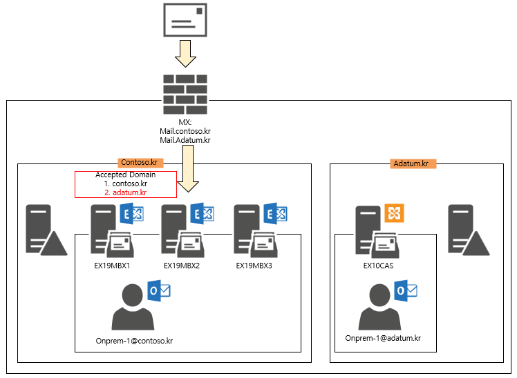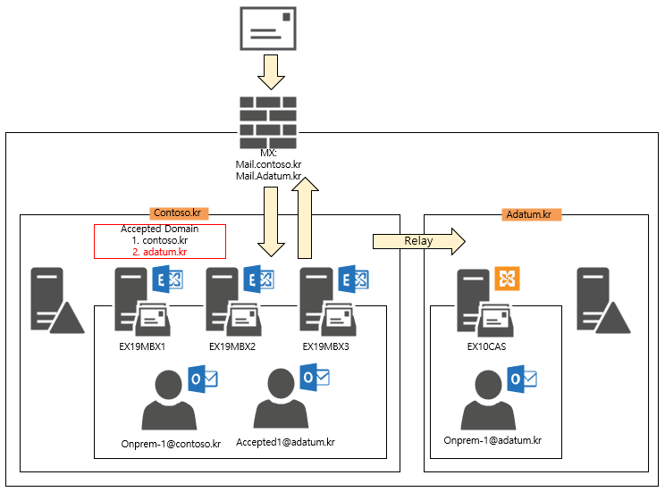 | Accepted domains are the SMTP name spaces (also known as address spaces) that you configure in an Exchange organization to receive email messages. For example, if your company registered the domain contoso.com, and you configured a mail exchanger (MX) record in your Internet DNS for contoso.com, you need to configure contoso.com as an accepted domain in your Exchange organization to accept messages that are addressed to @contoso.com recipients. 허용 도메인은 전자 메일 메시지를 받도록 Exchange SMTP 이름 공간(주소 공간)입니다. 예를 들어 회사에서 contoso.com 도메인을 등록하고 인터넷 DNS에서 contoso.com 용 MX(메일 교환기) 레코드를 구성한 경우 contoso.com 받는 사람에게 보낸 메시지를 수락하도록 Exchange 조직의 허용 도메인으로 contoso.com 구성해야 합니다. |