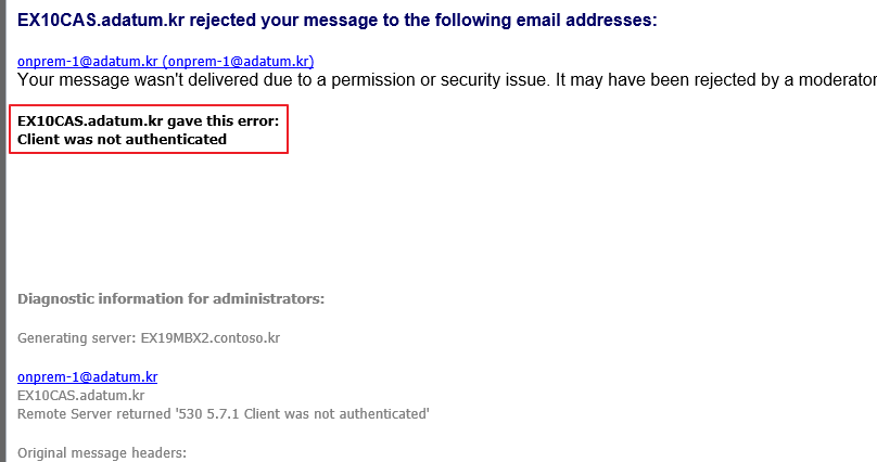 이번에는 Adatum.kr 의 EX2010에서 차단된 것으로 확인됩니다. Client was not authenticated 로 봐서는 커넥터 생성이나 설정이 필요한 것으로 보입니다.