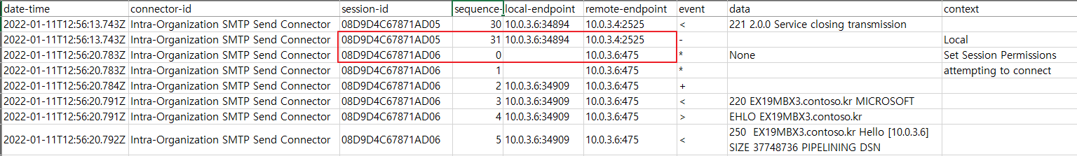 EX19MBX3 의 SMTP Receive 로그를 다음 세션 ID를 계속 살펴 보면, 10.0.3.6:475로 SMTP 통신이 이루어지는 것으로 확인됩니다.