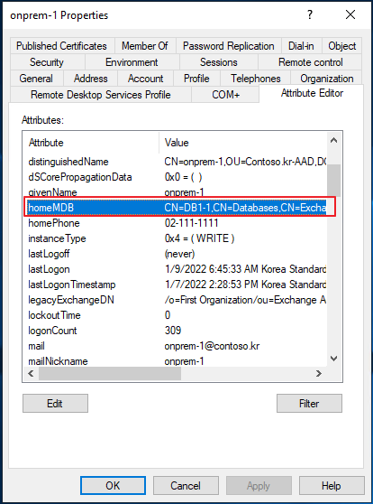 | Each mailbox consists of an Active Directory user and the mailbox data that's stored in the Exchange mailbox database (as shown in the following figure). All configuration data for the mailbox is stored in the Exchange attributes of the Active Directory user object. The mailbox database contains the actual data that's in the mailbox associated with the user account. 각 사서함은 Active Directory 사용자와 다음 그림과 같이 Exchange 사서함 데이터베이스에 저장된 사서함 데이터로 구성됩니다. 사서함의 모든 구성 데이터는 Active Directory Exchange 특성에 저장됩니다. 사서함 데이터베이스에는 사용자 계정과 연결된 사서함에 있는 실제 데이터가 포함됩니다. |
