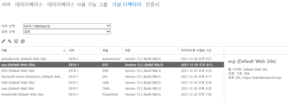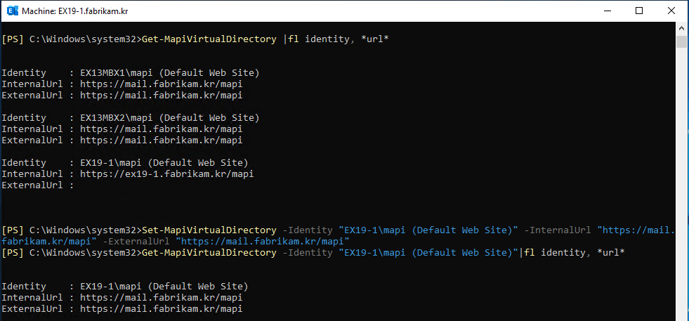 Set-MapiVirtualDirectory -Identity "<서버>\mapi (Default Web Site)" -InternalUrl "https://mail.fabrikam.kr/mapi" -ExternalUrl "https://mail.fabrikam.kr/mapi"