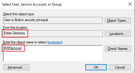 Location 을 Entire Directory 지정 - MIMService 계정을 지정 - OK