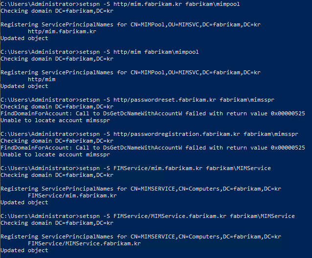 setspn -S FIMService/mim.fabrikam.kr fabrikam\MIMService