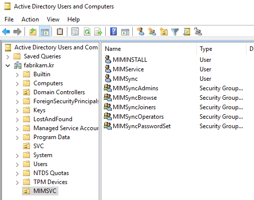 New-ADGroup –name MIMSyncJoiners –GroupCategory Security –GroupScope Global –SamAccountName MIMSyncJoiners -Path "OU=MIMSVC,DC=Fabrikam,DC=kr"