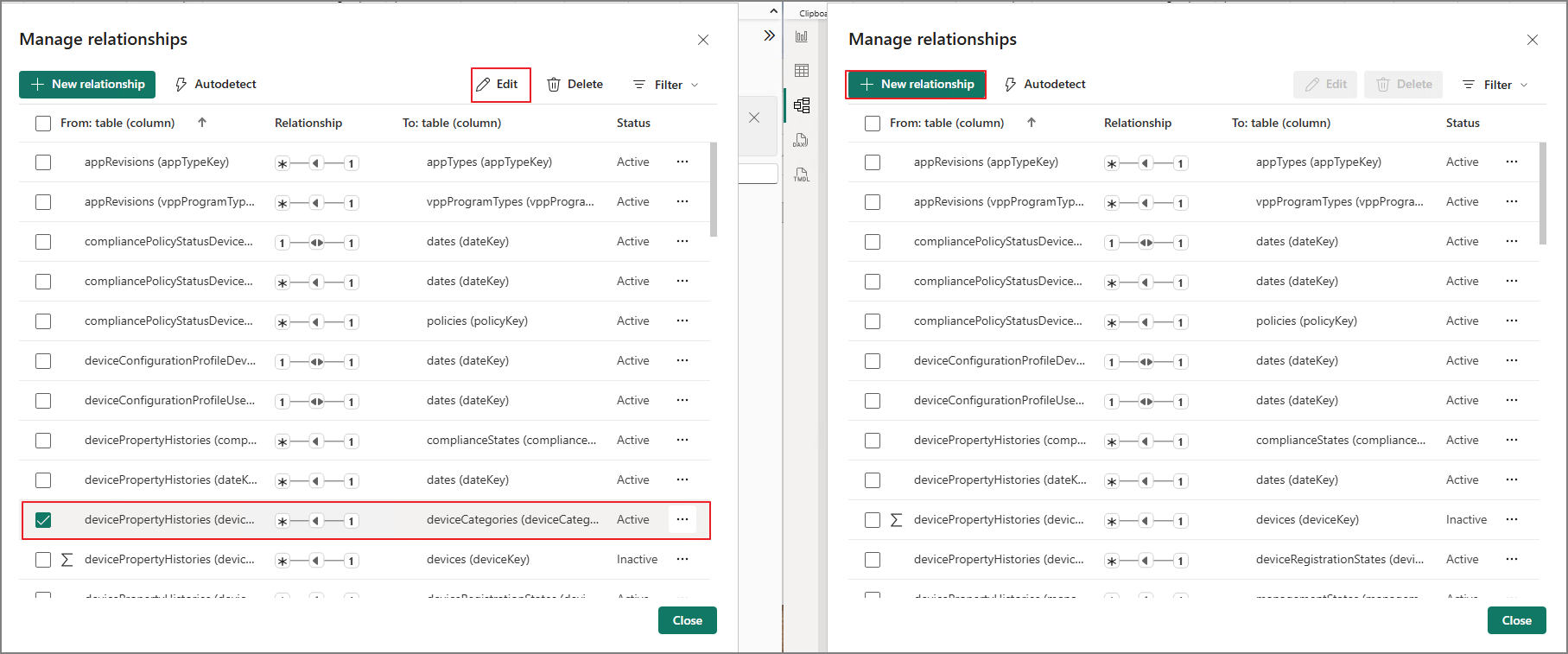 템플릿에는 존재하는 관계가 내 BI에는 존재하지 않는 것을 알 수 있습니다.