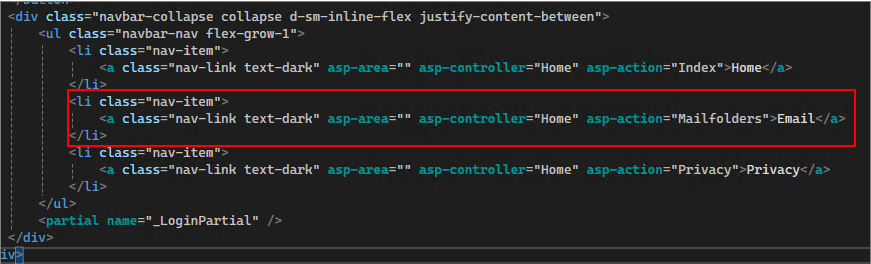 <a class="nav-link text-dark" asp-area="" asp-controller="Home" asp-action="Mailfolders">Email</a>