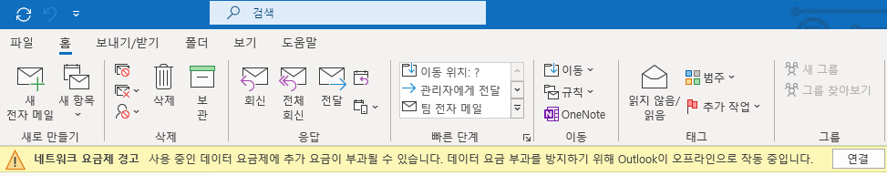 네트워크 요금제 경고 사용 중인 데이터 요금제에 추가 요금이 부과될 수 있습니다. 데이터 요금 부과를 방지하기 위해 Outlook이 오프라인으로 작동 중입니다.