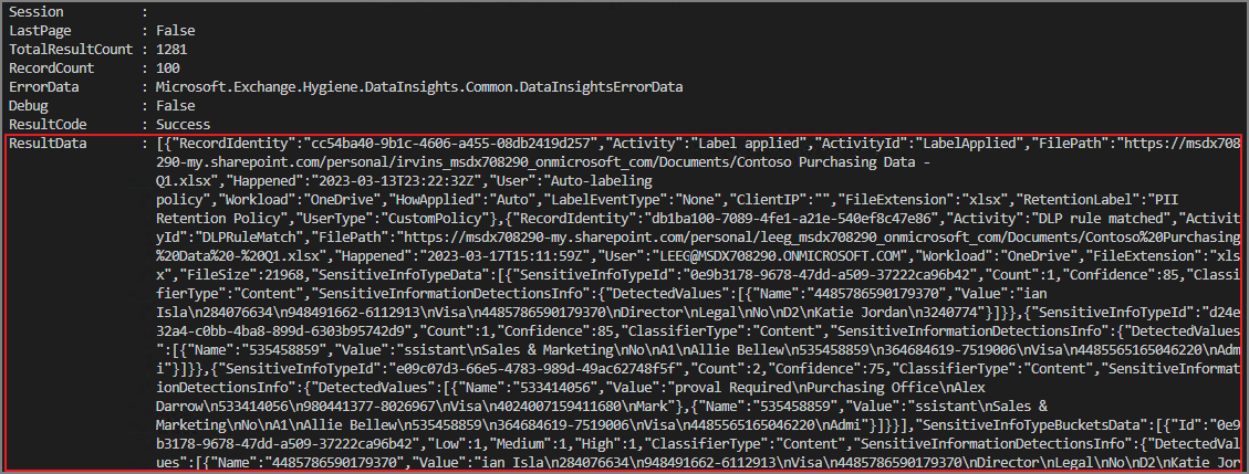 $selectedProperties = (($res.ResultData) | ConvertFrom-Json) | sort Happened | Select-Object Happened, RecordIdentity, User, Activity, ActivityId, Application, ClientIP, DataState, DestinationLocationType, DeviceName, DlpAuditEventMetadata, EmailInfo, EndpointOperation, EnforcementMode, EvidenceFile, FileExtension, FilePath, FileSize, FileType, Hidden, HowApplied, HowAppliedDetail, IRMContentId, IsProtected, IsProtectedBefore, JitTriggered, Justification, LabelEventType, MDATPDeviceId, OldSensitivityLabel, Platform, PolicyMatchInfo, PreviousFileName, PreviousProtectionOwner, ProductVersion, ProtectionEventType, ProtectionOwner, ProtectionType, RetentionLabel, RMSEncrypted, @{Name='SensitiveInfoTypeBucketsData'; Expression={$_.SensitiveInfoTypeBucketsData -join ','}}, @{Name='SensitiveInfoTypeData'; Expression={$_.SensitiveInfoTypeData -join ','}}, SensitivityLabel, Sha1, Sha256, SourceLocationType, TargetDomain, TargetFilePath, TargetPrinterName, TemplateId, UserSku, UserType, Workload