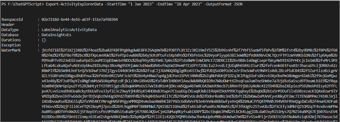 $res = Export-ActivityExplorerData -StartTime "1 Jan 2023" -EndTime "28 Apr 2023" -OutputFormat JSON