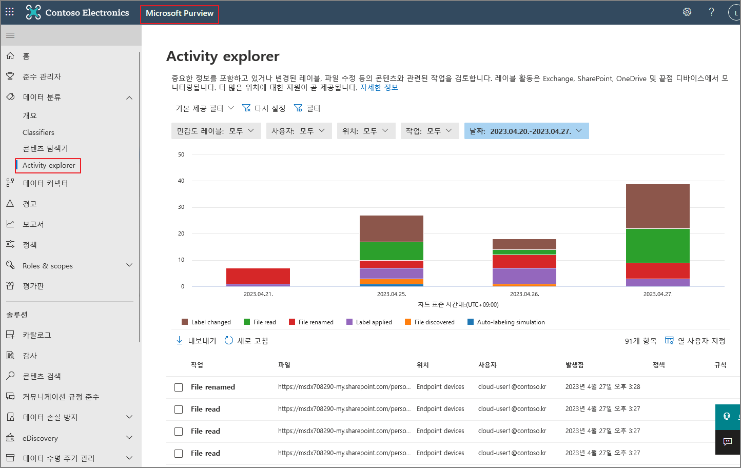 Export-ActivityExplorerData cmdlet을 사용하여 Microsoft 365 Purview 규정 준수 포털 데이터 분류> 활동 탐색기에서 활동을 내보냅니다.