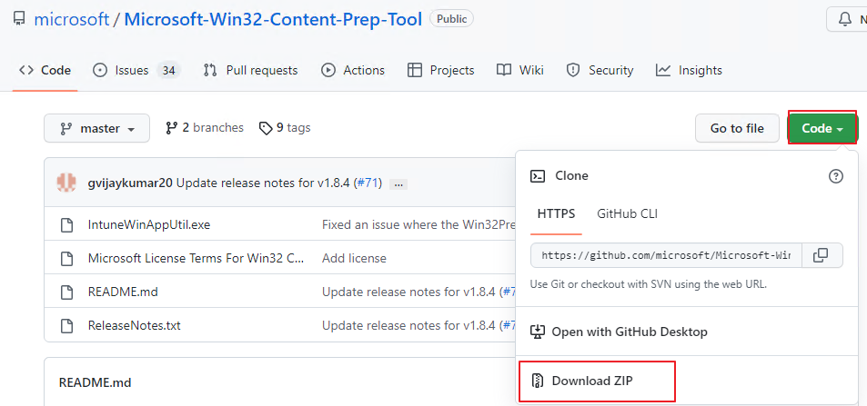 아래의 페이지에 접속하여 IntuneWinAppUtil 파일을 다운로드 합니다. (Code -> Download ZIP)
