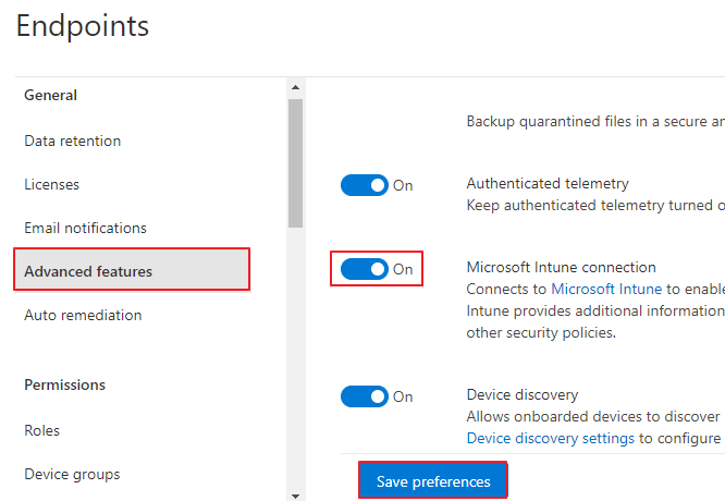 Advanced features -> Microsoft Intune connection -> On -> Save preferences