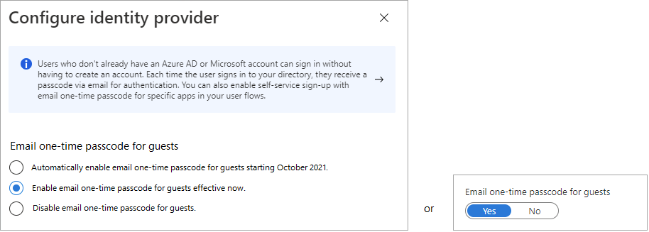 | Azure AD supports external identity providers like Facebook, Microsoft accounts, Google, or enterprise identity providers. You can set up federation with identity providers so your external users can sign in with their existing social or enterprise accounts instead of creating a new account just for your application. Learn more about identity providers for External Identities. Azure AD는 Facebook, Microsoft 계정, Google 또는 엔터프라이즈 ID 공급자와 같은 외부 ID 공급자를 지원합니다. 외부 사용자가 애플리케이션용으로 새 계정을 만드는 대신 기존 소셜 또는 엔터프라이즈 계정으로 로그인할 수 있도록 ID 공급자와의 페더레이션을 설정할 수 있습니다. 외부 ID용 ID 제공자에 대해 자세히 알아보세요 . |