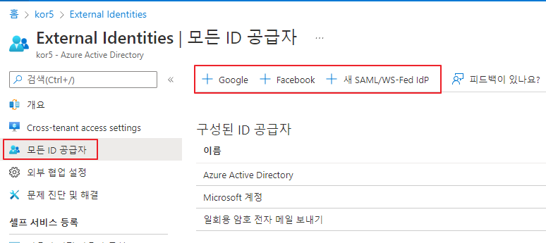 Azure Portal -> Azure Active Directory -> External Identites -> 모든 ID 공급자 메뉴로 이동합니다.