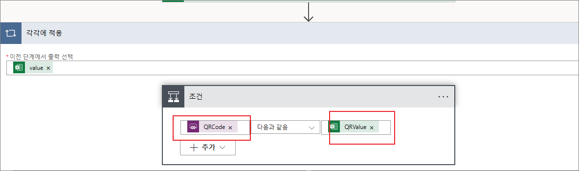 QRCode와 QRValue가 일치하면 흐름이 실행되도록 구성합니다.