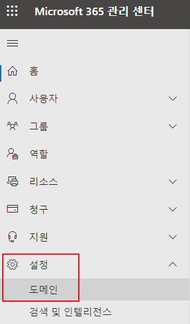 도메인 구매가 완료되었다면, M365 관리센터 - 설정 - 도메인 메뉴로 이동합니다.