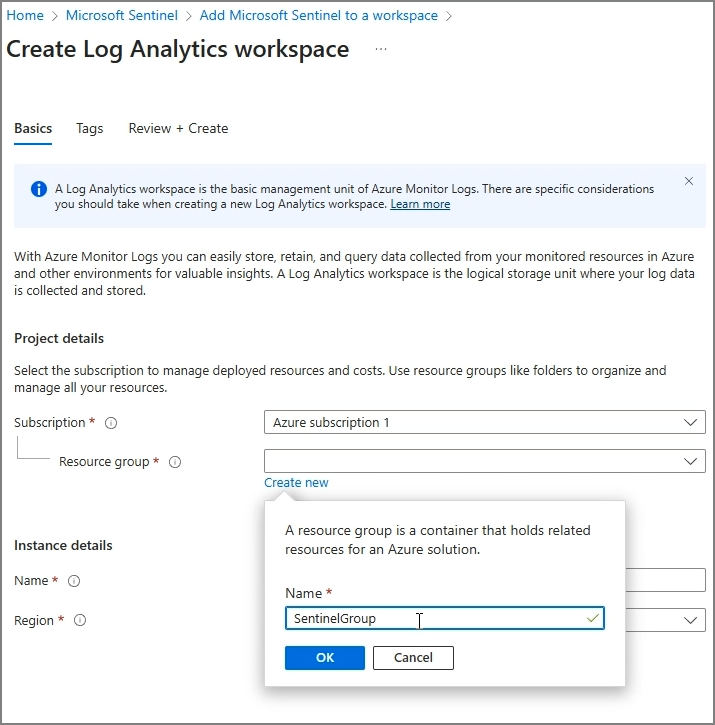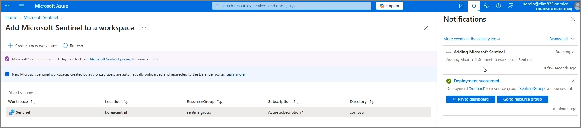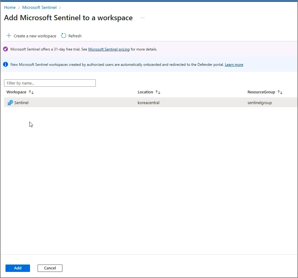 다시 Sentinel로 이동하여 Create new Microsoft Sentinel